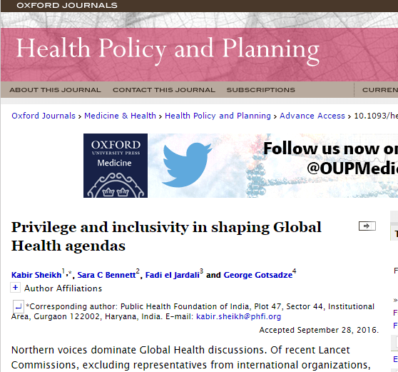 “Northern voices dominate Global Health discussions. Of recent Lancet Commissions, excluding representatives from international organizations, 70% of commissioners on the Women and Health commission came from the global North, and likewise, 71% of the Health and Climate Change commission, 72% of the Global Surgery commission and 73% of the Global Health commission (Lancet 2016). Only two out of the 16-member Board of Directors of the Consortium of Universities of Global Health come from the global South (CUGH 2016). No current or past president and only one current member of the World Health Summit’s scientific committee is from the global South (WHS 2016). Only one of the 17 advisory board members of the journal Global Health Governance is based in a low/middle income country (LMIC) institution (GHG 2016).