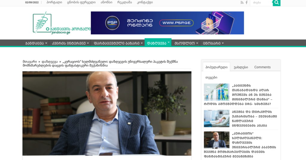 საინფორმაციო პორტალი ჯანდაცვა.ჯი საერთაშორისო ფონდი კურაციოს პრეზიდენტთან ინტერვიუს აქვეყნებს. „კურაციოს“ ხელმძღვანელი: „დაზღვევის უნივერსალური პაკეტი აუცილებლად უნდა შეიქმნას, თუმცა მისი შეძენა ნებაყოფლობითი უნდა იყოს“ დაზღვევის უნივერსალური პაკეტის შექმნა – ესაა მომხმარებლების დაცვის ფანტასტიკური მექანიზმი. ამის შესახებ საერთაშორისო ფონდ „კურაციოს“ ხელმძღვანელმა გიორგი გოცაძემ jandacva.ge-ს განუცხადა. ექსპერტთა იმ ნაწილისგან განსხვავებით, რომლებიც ასევე მოითხოვენ უნივერსალური პაკეტის შექმნას და ამბობენ, […]