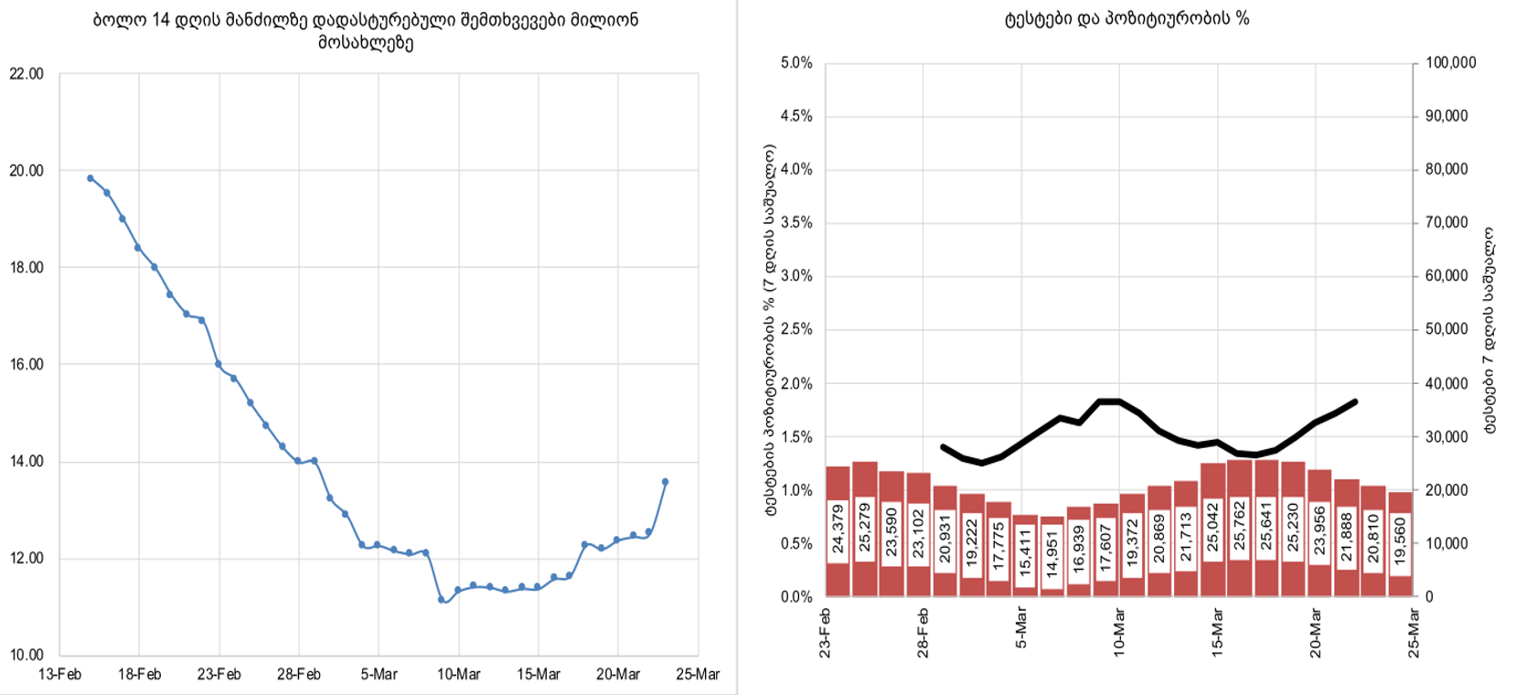 - და ბოლოს, ასევე იზრდება ტესტირების 7 დღიანი საშუალო პოზიტიურობის მაჩვენებელი, თუმცა ეს მაჩვენებელი ქვეყანაში ჩატარებული დღიური ტესტების რაოდენობის მიმართ მეტად სენსიტიურია (რაც შაბათ-კვირას მნიშვნელოვნად მცირდება) და გარკვეული რყევებით ხასიათდება.